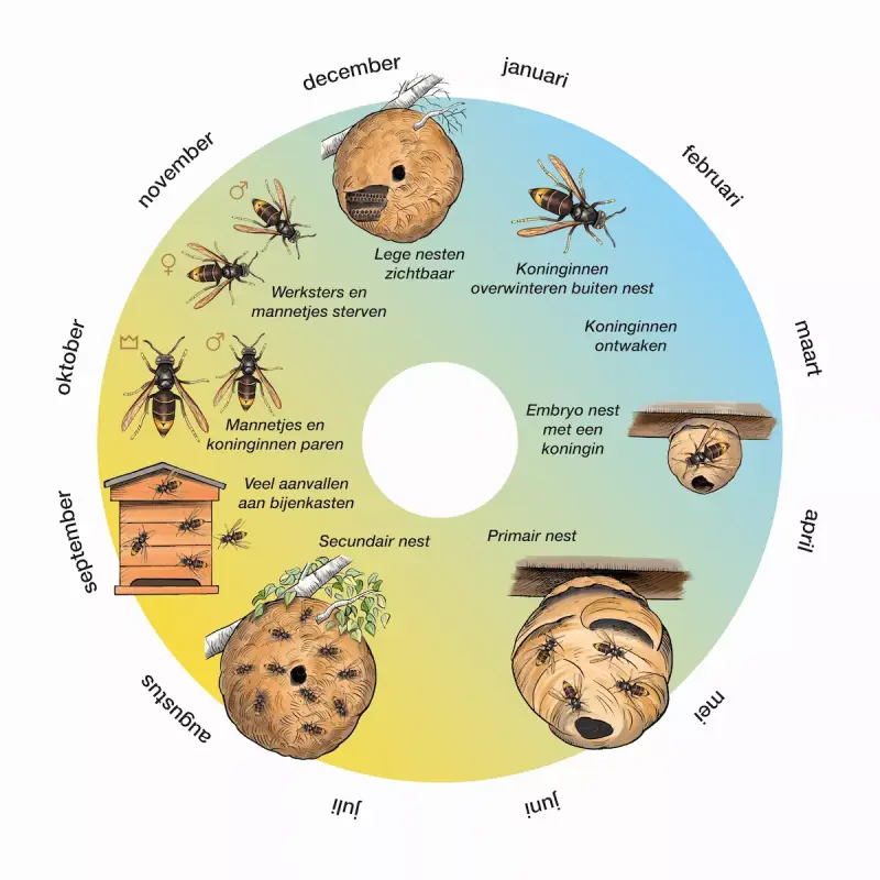 Aziatische hoornaars komen niet op zoetigheid af; de gouden regel is: laat ze met rust, dan laten ze jou ook met rust.